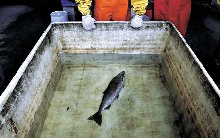 A salmon floats in a tank of clear water after it died from four hours of exposure to unfiltered highway runoff water.